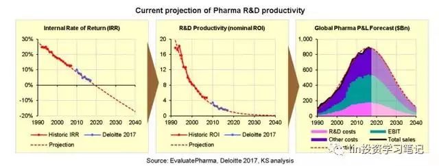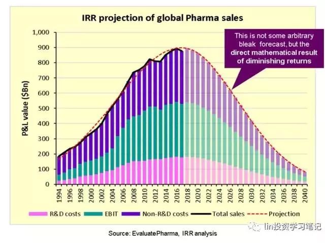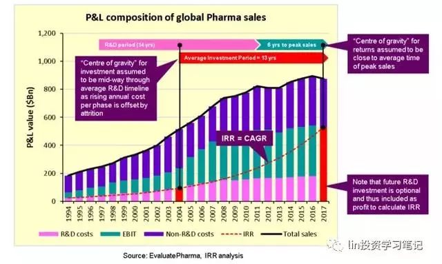 因此,現(xiàn)在我們可以將平均投資回報率(IRR)計算為這三者的年復合增長率:過去的研發(fā)投資、由此產(chǎn)生的利潤(EBIT)、并加上未來的研發(fā)成本,如下圖所示,來自EvaluatePharma的行業(yè)損益數(shù)據(jù):