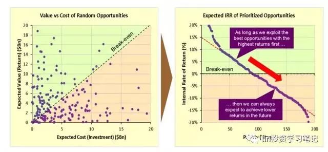 這似乎不可思議,但請記住,這并非武斷地唱淡。這是邊際效益遞減規(guī)律的直接數(shù)學結(jié)果,我們已經(jīng)看到了前面的分析過程,而且我們也已經(jīng)通過生成有限投資機會的隨機數(shù)、再為此排優(yōu)先級來模擬這一過程。