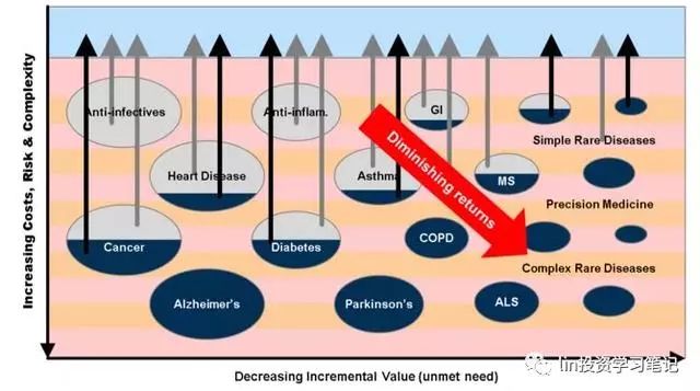 本質(zhì)上,新藥的發(fā)現(xiàn)就像石油鉆探一樣,我們不斷地排優(yōu)先級,把最大、最好、最廉價、最容易、且預期回報率最高的機會放在最前面開采,而那些吸引力較小的地方將留待以后開發(fā)。到最后,遺留下來可供開采的資源會令我們?nèi)氩环蟪觯?/span>