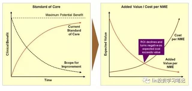 市場的標準,使研發(fā)更加昂貴,難度更大,也不太可能實現(xiàn)任何漸進式的改善,同時還減少了未來可能的改善空間。因此,我們越是提高醫(yī)療標準,繼續(xù)改善療效就越發(fā)困難和昂貴,所以即便我們花費得越來越多,卻也只能獲得越來越少的療效改善,為患者帶來的收益也越少,從而導致投資回報率遞減,如下所示: