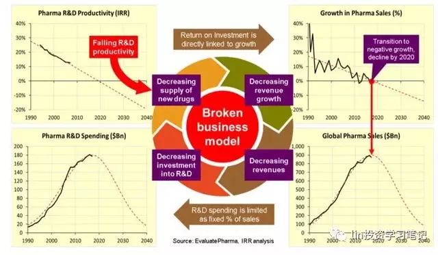 我們所看到的是一個正在進入惡性循環(huán)中的行業(yè),該行業(yè)正在負增長,并且無力扭轉(zhuǎn)下滑趨勢,因為它的基本商業(yè)模式已經(jīng)被邊際效益遞減規(guī)律所淘汰:研發(fā)效率的降低和投資回報的減少導致銷售額增長的減少。最終,增長變?yōu)樨摂?shù),銷售開始收縮。銷售額的減少會導致重新投入到研發(fā)中的資金的減少,導致銷售進一步下滑。惡性循環(huán)不斷持續(xù),直到這個行業(yè)萎縮到消失。