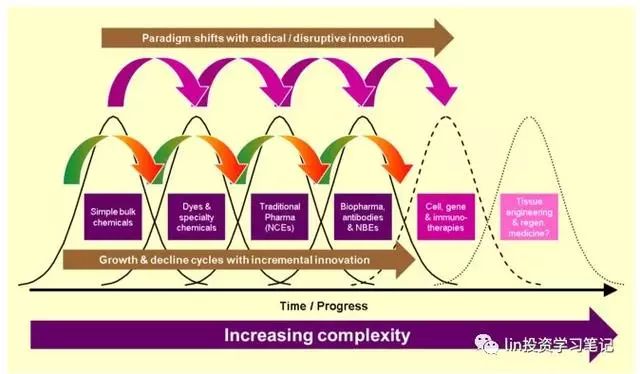正如制藥行業(yè)從化學工業(yè)衍生出來,生物制藥行業(yè)也已經(jīng)從制藥行業(yè)衍生出來,制藥和生物制藥行業(yè)一道將會衍生出完全不同的東西,而這正是不斷增加復雜性的歷史趨勢。我們需要解決的那些緊迫的醫(yī)療難題倚賴于更復雜的生物醫(yī)學手段,比如細胞與基因治療、組織工程和再生醫(yī)學: