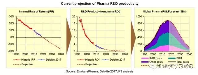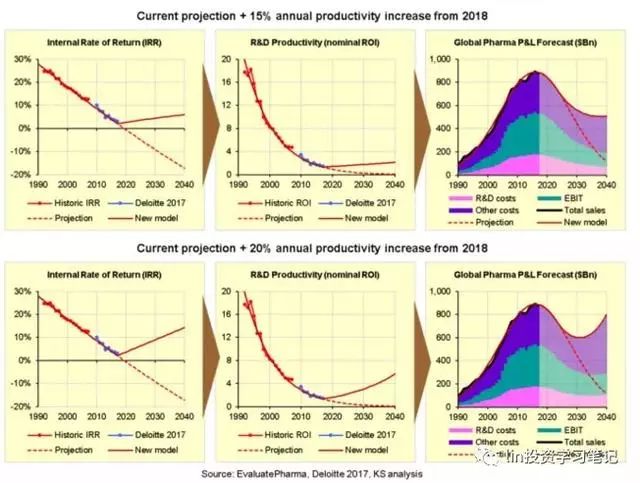 內(nèi)部收益率、名義研發(fā)效率/投資回報率之間的直接數(shù)學關聯(lián),以及過去和未來的損益表現(xiàn)可以由下面3張圖來展示。注意,每張圖上由紅色的點表示的趨勢與根據(jù)上述公式所計算出的趨勢完全一致,而且也非常符合歷史損益數(shù)據(jù)及德勤最近測算的內(nèi)部收益率。