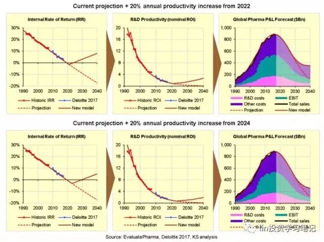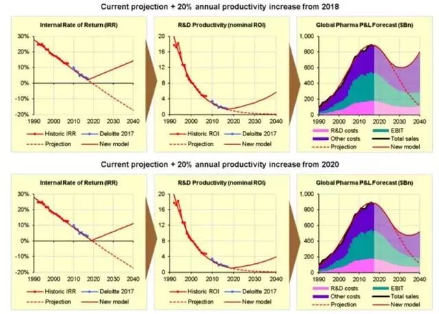 事實上,我們需要提升名義研發(fā)效率/投資回報率至少每年20%才能逆轉(zhuǎn)損益表現(xiàn)的下滑,而且即便如此,行業(yè)的銷售和利潤仍然會下滑大約三分之一,在2030年見底后才會重新上升。這是因為,將研發(fā)效率的提升轉(zhuǎn)化為銷售和利潤的增長需要多年的投資期。換句話說,未來10年的損益表現(xiàn)已經(jīng)由以往和當前低水平的研發(fā)效率所決定,我們也做不了什么。