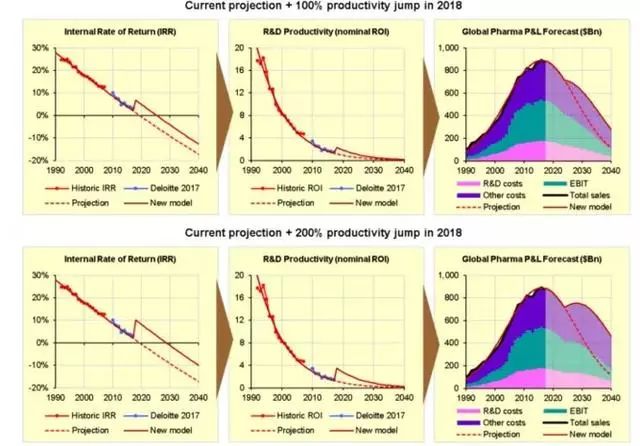持續(xù)漸進式的提升需要持續(xù)多年、年復一年的研發(fā)效率提升,與之不同的是重大突破,一些新技術可以在非常短的時間內(nèi)、很可能僅1年內(nèi),就能一次性地大幅提升研發(fā)效率。這些年里,我們看到了一些藥物發(fā)現(xiàn)方面的技術突破,不過沒有哪一次突破能對研發(fā)效率的快速穩(wěn)定的下滑產(chǎn)生什么影響,但我們?nèi)匀豢梢栽O想一下:如果現(xiàn)在,即2018年,我們就可以將研發(fā)效率提升100%、200%、300%,甚至400%呢?這會對預測的損益表現(xiàn)產(chǎn)生多大沖擊?