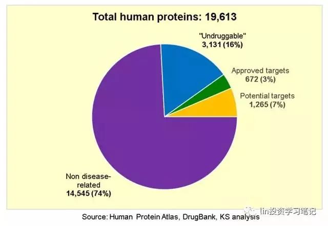 這樣,其中5,068種蛋白質(zhì)與疾病有關聯(lián),3,131種(人類蛋白質(zhì)總數(shù)中的16%)被認為是“不可成藥”,要么它們明顯的不可能與小分子藥物相結(jié)合,要么它們在細胞內(nèi)部,而大的蛋白質(zhì)無法穿透細胞膜。我們必須排除這些潛在可能作為新藥靶點的蛋白質(zhì),因為我們當前找不到靶向它們的辦法,所以它們無法滿足上述的條款2。