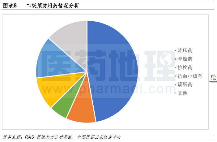 根據(jù)醫(yī)院處方分析系統(tǒng)數(shù)據(jù)庫顯示,我國腦卒中在二級預(yù)防中主要應(yīng)用的是降壓藥,其次為調(diào)脂藥。其中,降壓藥中,沙坦類和地平類用量最多,合計占比為74%;在降糖藥中,主要應(yīng)用于II型糖尿病的藥物是匹格列酮和二甲雙胍,合計占比超過50%;在抗栓藥中,各類產(chǎn)品比較分散,主要為法華林;在抗血小板藥物中,阿斯匹林和氯吡格雷為主要處方產(chǎn)品,合計占比64%;調(diào)血脂藥物中,幾乎全部為他汀類和貝特類藥物,合計占比超過95%,他汀類占絕大多數(shù)。