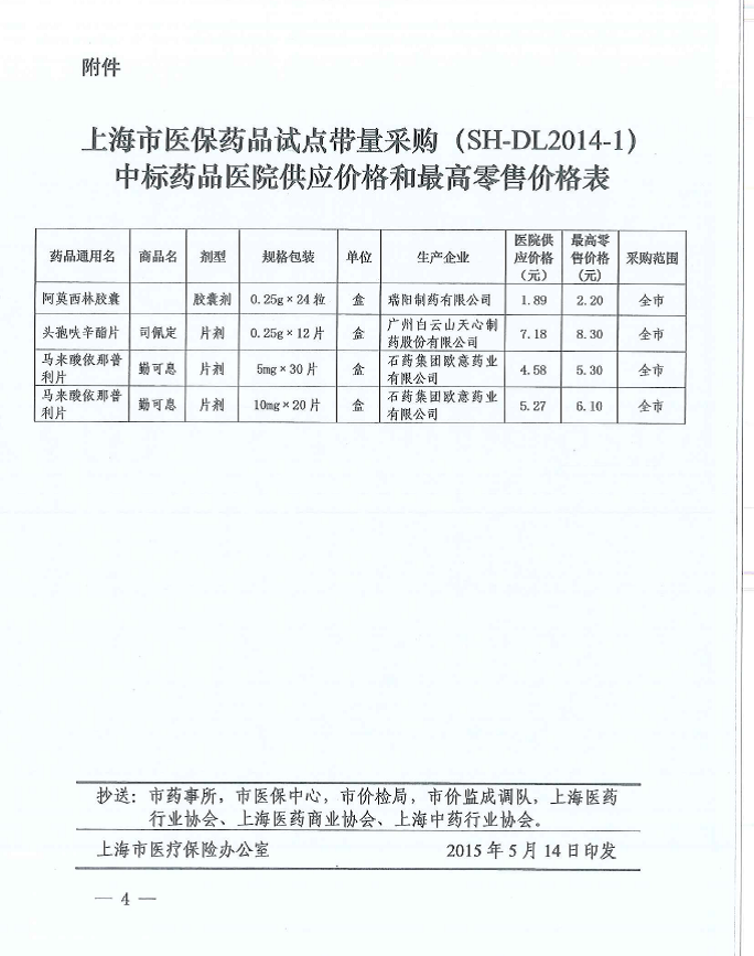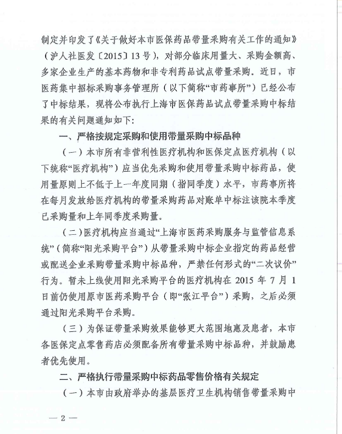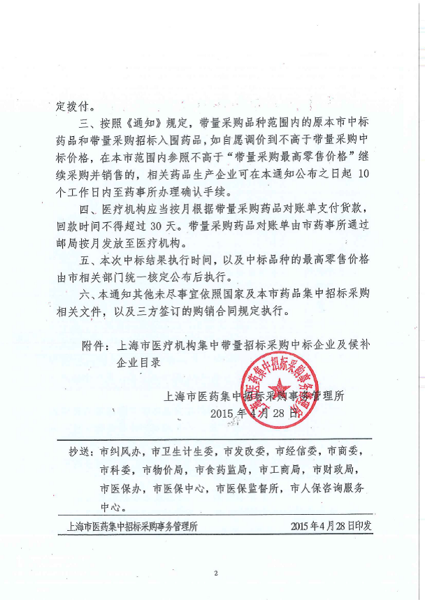 附件二:《關(guān)于公布執(zhí)行上海市醫(yī)保藥品試點(diǎn)帶量采購(gòu)中標(biāo)結(jié)果有關(guān)問(wèn)題的通知》(滬醫(yī)保辦〔2015〕28 號(hào))