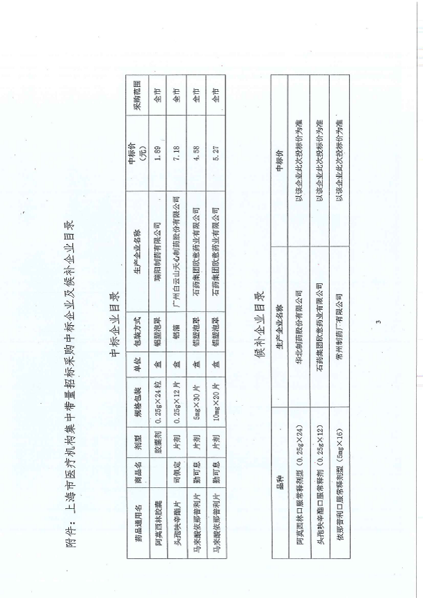 去年12月末,上海市醫(yī)藥集中招標(biāo)采購(gòu)事務(wù)所公布上海醫(yī)保帶量招標(biāo)采購(gòu)公告,首批納入帶量采購(gòu)的品種為頭孢呋辛、阿莫西林、依那普利三個(gè)基藥品種,并于今年1月14日正式開(kāi)標(biāo),經(jīng)過(guò)嚴(yán)格的質(zhì)量評(píng)審和激烈的價(jià)格競(jìng)爭(zhēng),廣州白云山天心制藥股份有限公司的頭孢呋辛酯片、瑞陽(yáng)制藥有限公司阿莫西林膠囊、石藥集團(tuán)歐意藥業(yè)有限公司的馬來(lái)酸依那普利片脫穎而出,成為本次帶量采購(gòu)試點(diǎn)的中標(biāo)企業(yè)。國(guó)藥控股股份有限公司因在投標(biāo)前被這三家企業(yè)定為配送商,所以隨著這三家企業(yè)的中標(biāo),國(guó)藥控股股份有限公司也成為了本次上海市帶量采購(gòu)藥品的唯一配送企業(yè)。