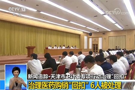 據(jù)此次央視的報道,在會上,天津市衛(wèi)計委曝光了天津某醫(yī)院醫(yī)務(wù)人員接受醫(yī)藥代表回扣的行為。按照程序,相關(guān)部門對6名涉事醫(yī)生給予了黨內(nèi)嚴重警告,行政記過等黨紀政紀處分,以及警示、提醒、談話處理。