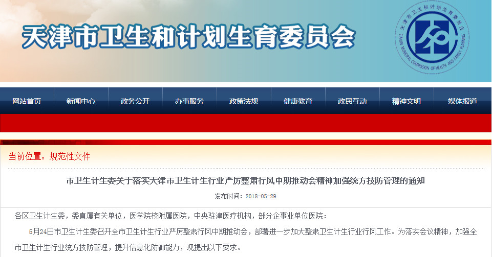 隨后,天津市衛(wèi)計委于今天印發(fā)通知稱,全市二級及以上醫(yī)療機構(gòu)要全面加強技防管理,全部上線使用防統(tǒng)方軟件,進一步加大整肅衛(wèi)生計生行業(yè)行風(fēng)工作。
