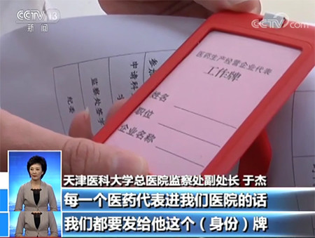 天津市醫(yī)科大學(xué)總醫(yī)院監(jiān)察處副處長于杰則表示,醫(yī)院的所有科室,不允許在其他的區(qū)域私自接待醫(yī)藥代表,目前出臺了“三定兩有”的規(guī)定:規(guī)定時間、規(guī)定地點、人員還有接待流程。每一個醫(yī)藥代表進我們醫(yī)院的話,我們都要發(fā)給她這個(身份)牌。