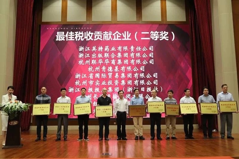 區(qū)長柴世民為榮獲2018年度下城區(qū)“最佳稅收貢獻(xiàn)企業(yè)二等獎(jiǎng)”的企業(yè)代表頒獎(jiǎng)。浙江省國際貿(mào)易集團(tuán)有限公司、浙江英特藥業(yè)有限責(zé)任公司榮獲最佳稅收貢獻(xiàn)企業(yè)二等獎(jiǎng)。