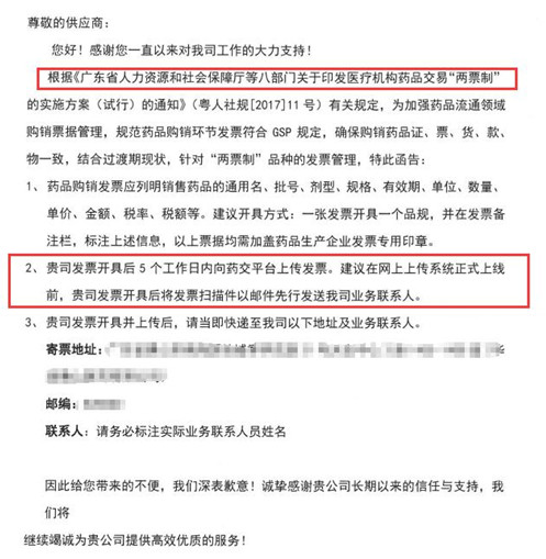 與此同時(shí),一張某商業(yè)公司的函告已經(jīng)在坊間流傳,該函告是商業(yè)公司發(fā)給藥品生產(chǎn)企業(yè),主要內(nèi)容是根據(jù)廣東兩票制有關(guān)規(guī)定,為加強(qiáng)藥品流通領(lǐng)域購銷票據(jù)管理,所做出的相關(guān)要求(如下圖)。