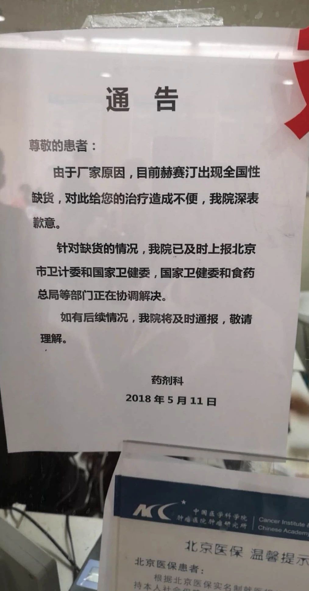 (5月,懸掛于北京中國醫(yī)學(xué)科學(xué)院腫瘤醫(yī)院掛號處的赫賽汀斷貨通知)