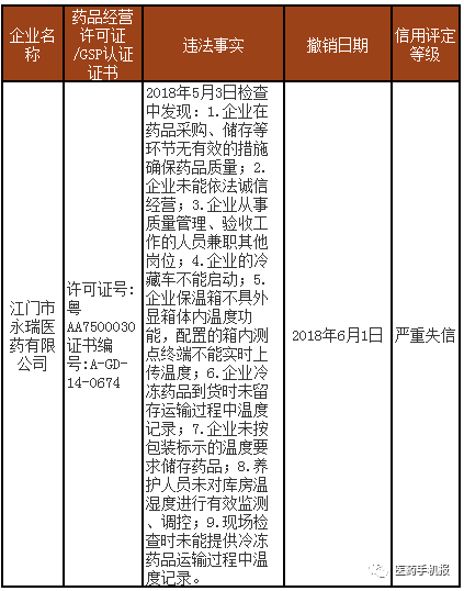 據(jù)了解,因江門市永瑞醫(yī)藥有限公司嚴(yán)重違反《藥品經(jīng)營質(zhì)量管理規(guī)范》規(guī)定,廣東省藥監(jiān)局依據(jù)《藥品經(jīng)營質(zhì)量管理規(guī)范認(rèn)證管理辦法》第45條,依法撤銷其《藥品經(jīng)營質(zhì)量管理規(guī)范認(rèn)證證書》,并根據(jù)《廣東省食品藥品監(jiān)督管理局藥品生產(chǎn)經(jīng)營單位信用分類管理的實施辦法》(粵食藥監(jiān)法〔2014〕109號)規(guī)定,評定其信用等級為“嚴(yán)重失信”。