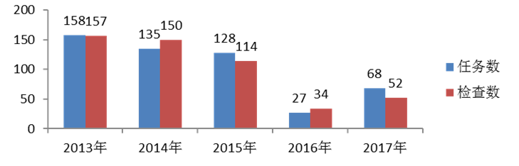 圖1-1 近五年藥品注冊(cè)生產(chǎn)現(xiàn)場(chǎng)檢查任務(wù)數(shù)量圖