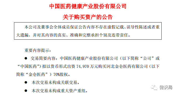 昨天(6月13日)晚間,中國(guó)醫(yī)藥健康產(chǎn)業(yè)股份有限公司(以下簡(jiǎn)稱“中國(guó)醫(yī)藥”)發(fā)布公告,公司擬以貨幣形式出資7.497億元購(gòu)買河北金侖醫(yī)藥有限公司(以下簡(jiǎn)稱“金侖醫(yī)藥”)70%股權(quán)。