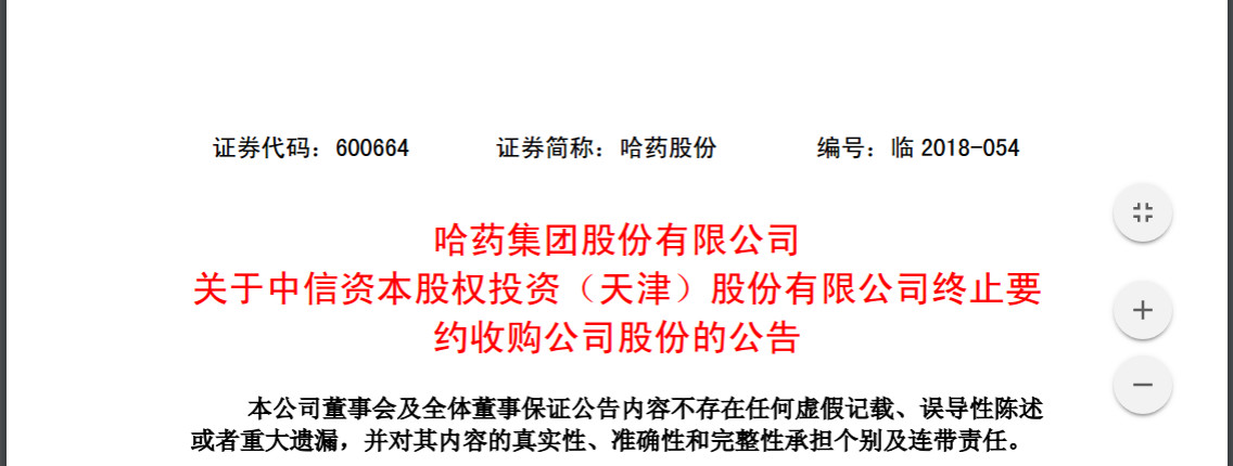 6月21日,哈藥股份發(fā)布公告,宣布中信資本終止對(duì)其要約收購。哈藥集團(tuán)混改之路,暫時(shí)停止。 ▍中信謀求15億成哈藥集團(tuán)實(shí)控人 哈藥集團(tuán)混改籌劃時(shí)間近10個(gè)月,正式啟動(dòng)于去年9月,同年12月25日,混改方案浮出水面。 2017年12月25日,哈爾濱市國(guó)資委、中信冰島、華平冰島、哈藥集團(tuán)與中信資本醫(yī)藥簽署《關(guān)于哈藥集團(tuán)有限公司之增資協(xié)議》。 根據(jù)上述協(xié)議約定,中信資本醫(yī)藥對(duì)哈藥集團(tuán)實(shí)施增資并認(rèn)購哈藥集團(tuán)新增注冊(cè)資本15億元。 本次增資完成后,中信資本控股旗下三家企業(yè)(中信冰島、華平冰島、中信資本醫(yī)藥)合計(jì)持有哈藥集團(tuán)60.86%的股權(quán),哈爾濱市國(guó)資委持有哈藥集團(tuán)的股權(quán)下降為32.02%,中信資本控股將成為哈藥集團(tuán)的間接控股股東。 哈藥集團(tuán)的實(shí)際控制人將由哈爾濱市國(guó)資委變更為中信資本控股。 當(dāng)時(shí)考慮到中信資本直接持股的法律障礙,中信資本還指定其境內(nèi)子公司中信資本天津?qū)Ρ敬我s收購中哈藥股份A股上市流通股份履行要約收購義務(wù),并由中信資本天津持有接受要約的股份。 然而,隨著政策的變化,中信資本的增資擴(kuò)股還是遇到了障礙。 ▍審批進(jìn)行大半 在10個(gè)月的時(shí)間里,中信資本增資事宜的審批,已經(jīng)進(jìn)行了大半。 2017年12月25日,哈爾濱市國(guó)資委、中信冰島、華平冰島、哈爾濱國(guó)企重組管理顧問有限公司和哈藥集團(tuán)與中信資本醫(yī)藥簽署《關(guān)于哈藥集團(tuán)有限公司之增資協(xié)議》。 2017年12月25日,哈藥集團(tuán)召開董事會(huì),同意中信資本醫(yī)藥對(duì)哈藥集團(tuán)實(shí)施增資,并就上述增資相關(guān)事宜簽署增資協(xié)議。 2018年1月10日,哈爾濱市國(guó)資委轉(zhuǎn)發(fā)了《哈爾濱市人民政府關(guān)于對(duì)哈藥集團(tuán)增資有關(guān)事宜的批復(fù)》(哈政發(fā)[2018]1號(hào)),哈爾濱市人民政府原則同意哈藥集團(tuán)實(shí)施增資擴(kuò)股。 2018年4月25日,中信資本控股收到《商務(wù)部經(jīng)營(yíng)者集中反壟斷審查不予禁止審查決定書》(商反壟審查函[2018]第13號(hào))。 至此,本次交易尚需黑龍江省國(guó)資委、國(guó)務(wù)院國(guó)資委等有權(quán)部門審批。 ▍政策有變,哈爾濱國(guó)資委要求終止 6月20日,哈爾濱市國(guó)資委出具《關(guān)于終止本次哈藥集團(tuán)增資擴(kuò)股有關(guān)事宜的通知》,具體內(nèi)容如下: 因哈藥集團(tuán)有限公司增資擴(kuò)股導(dǎo)致國(guó)有股東間接轉(zhuǎn)讓上市公司股權(quán),按照國(guó)務(wù)院國(guó)資委、證監(jiān)會(huì)《國(guó)有股東轉(zhuǎn)讓所持上市公司股份管理暫行辦法》(第19號(hào)令,以下簡(jiǎn)稱“19號(hào)令”)相關(guān)規(guī)定,我委及時(shí)履行了逐級(jí)審批程序。 2018年5月16日,國(guó)務(wù)院國(guó)資委、財(cái)政部、證監(jiān)會(huì)聯(lián)合印發(fā)《上市公司國(guó)有股權(quán)監(jiān)督管理辦法》(第36號(hào)令,以下簡(jiǎn)稱“36號(hào)令”),對(duì)上市公司國(guó)有股權(quán)監(jiān)督管理進(jìn)行有效規(guī)范。36號(hào)令將自2018年7月1日起施行,19號(hào)令同時(shí)廢止。 截至目前,經(jīng)與黑龍江省國(guó)資委和國(guó)務(wù)院國(guó)資委溝通,本次哈藥集團(tuán)增資擴(kuò)股方案按照19號(hào)令要求在2018年7月1日前將無法獲得批準(zhǔn)。 (圖片來源:界面新聞) 鑒于上述情況,考慮到國(guó)有股東間接轉(zhuǎn)讓上市公司股權(quán)事項(xiàng)相關(guān)政策規(guī)定出現(xiàn)重大變化,經(jīng)認(rèn)真研究,終止本次哈藥集團(tuán)有限公司增資擴(kuò)股事項(xiàng)。 下一步,我委將根據(jù)哈爾濱市人民政府對(duì)我市國(guó)有企業(yè)混合所有制改革工作部署,按照36號(hào)令有關(guān)規(guī)定和證監(jiān)會(huì)有關(guān)法律法規(guī),在2018年7月1日36號(hào)令生效后及時(shí)啟動(dòng)哈藥集團(tuán)混合所有制改革工作?!?br /> 鑒于以上情況,中信資本醫(yī)藥依據(jù)《關(guān)于哈藥集團(tuán)有限公司之增資協(xié)議》對(duì)哈藥集團(tuán)的本次增資已無法繼續(xù)進(jìn)行。 也就是說,資產(chǎn)總額達(dá)160多億的哈藥集團(tuán)仍以國(guó)資占主導(dǎo)地位。 ▍哈藥集團(tuán)資產(chǎn)總額達(dá)160億 據(jù)哈藥集團(tuán)官網(wǎng)信息,目前,哈藥集團(tuán)為中外合資企業(yè)。哈爾濱市國(guó)資委占45%,中信資本冰島投資有限公司持股22.5%,華平冰島投資有限公司持股22.5%,哈爾濱國(guó)企重組管理顧問有限公司持股10%。 哈藥集團(tuán)旗下?lián)碛泄幑煞?,人民同泰兩家上市公司(哈藥集團(tuán)持有哈藥股份46%股權(quán),哈藥股份持有人民同泰74.82%股權(quán))。 2017年,哈藥集團(tuán)資產(chǎn)總額162.56億元;固定資產(chǎn)39.28億元;凈資產(chǎn)94.67億元;實(shí)現(xiàn)營(yíng)業(yè)收入123.51億元;利潤(rùn)總額7.02億元;凈利潤(rùn)5.01億元,利稅18.1億元。 哈藥集團(tuán)2017年銷售收入超億元的品種達(dá)10個(gè),擁有“哈藥”、“三精”、“蓋中蓋”知名品牌。據(jù)悉,僅“哈藥”的品牌價(jià)值就達(dá)238.29億元。 而人民同泰主營(yíng)醫(yī)藥批發(fā