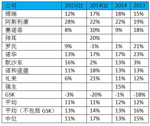 2015年第1季度制藥巨頭在華/新興市場(chǎng)銷(xiāo)售額增長(zhǎng)情況