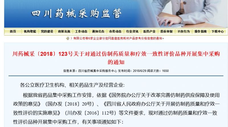 6月29日,四川藥械采購監(jiān)管發(fā)布《關(guān)于對通過仿制藥質(zhì)量和療效一致性評價(jià)品種開展集中采購的通知》。