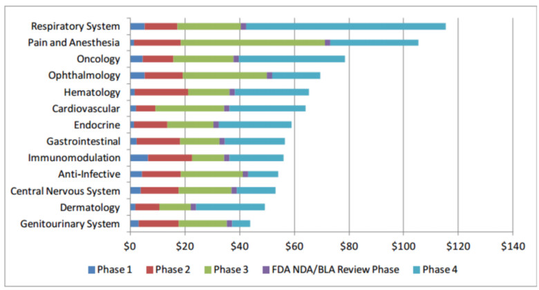 問題就在于,藥廠基本都不是一個(gè)能立馬賺錢的項(xiàng)目。根據(jù)美國的數(shù)據(jù),在2014年,單單腫瘤藥物的臨床研究投入(1期-4期臨床),就快達(dá)到8000萬美金(如下圖),這筆費(fèi)用占了藥物上市前經(jīng)費(fèi)的70%。