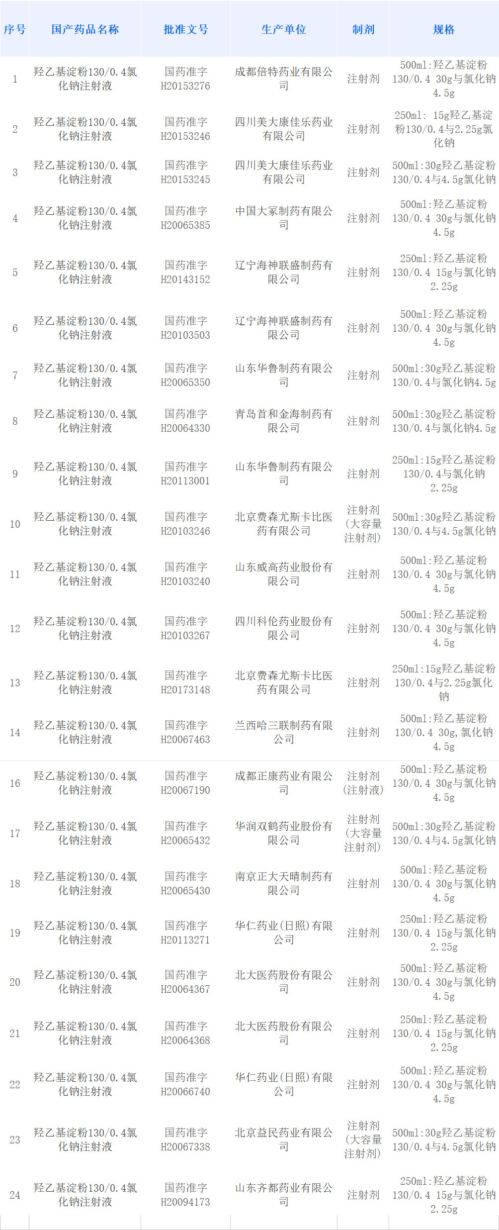 含羥乙基淀粉類藥品在我國已經(jīng)上市銷售使用多年,包括羥乙基淀粉20氯化鈉注射液、羥乙基淀粉40氯化鈉注射液、羥乙基淀粉130/0.4氯化鈉注射液和羥乙基淀粉200/0.5氯化鈉注射液等4個(gè)分子量產(chǎn)品。