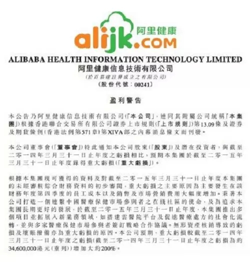 不過近日晚間,阿里健康發(fā)布盈利警告,稱對(duì)2014年4月1日至2015年3月31日財(cái)務(wù)狀況進(jìn)行盤點(diǎn)。與截至去年3月31日的年度虧損3460萬元相比,預(yù)期截至今年同期年度將出現(xiàn)重大虧損,增加約200%。這意味著將可能出現(xiàn)超過1億元的虧損。