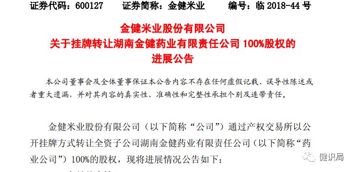 據《公告》顯示,為實現資源的合理配置,聚焦糧油主業(yè)的發(fā)展,提升公司資產的整體運營效率,公司于 2018 年 9 月 28 日召開的第七屆董事會第二十四次會議審議并全票通過了《關于掛牌轉讓湖南金健藥業(yè)有限責任公司 100%股權的議案》,董事會同意公司在產權交易所公開掛牌轉讓全資子公司藥業(yè)公司 100%的股權,擬轉讓價格不低于人民幣 1 元,并授權公司經營層全權辦理本次股權掛牌轉讓事宜。