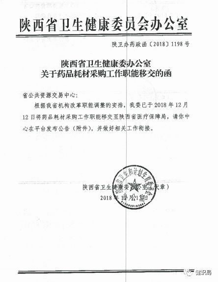 今天(12月14日),陜西省藥械集中采購網(wǎng)發(fā)布《陜西省衛(wèi)生健康委員會辦公廳關(guān)于藥品耗材采購工作職能移交的函》明確,自2018年12月12日起,中心有關(guān)藥品和醫(yī)用耗材采購工作對口聯(lián)系部門由陜西省衛(wèi)生健康委員會調(diào)整為陜西省醫(yī)療保障局。