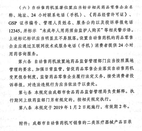 1月3日,成都市藥監(jiān)局發(fā)布《成都市食品藥品監(jiān)督管理局關于印發(fā)<成都市自動售藥機銷售非處方藥品管理規(guī)定(試行)>的通知》。