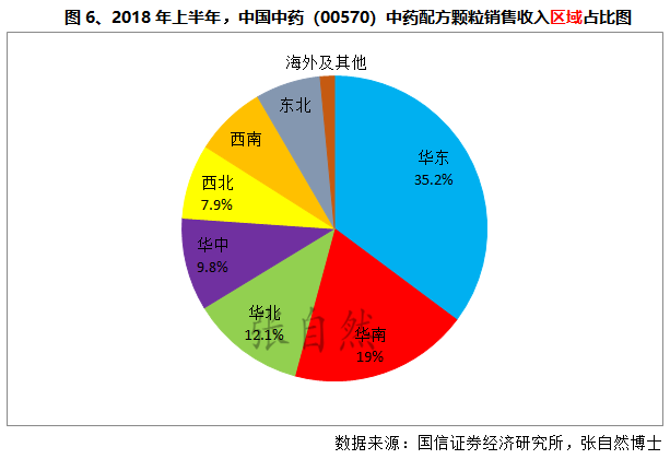 從2018年上半年中國(guó)中藥各區(qū)域銷售貢獻(xiàn)來(lái)看,當(dāng)屬旗下子企江蘇天江藥業(yè)所在地的華東和廣東一方藥業(yè)所在地的華南貢獻(xiàn)最大了,占比高達(dá)54%,而增速最快的則是西南市場(chǎng),同比增長(zhǎng)高達(dá)74.3%。