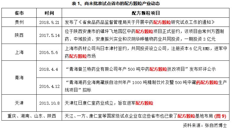 如表1所示的8個(gè)省市,雖尚未查到正式批準(zhǔn)試點(diǎn)的信息,但配方顆粒在其轄區(qū)內(nèi)也已有布局。