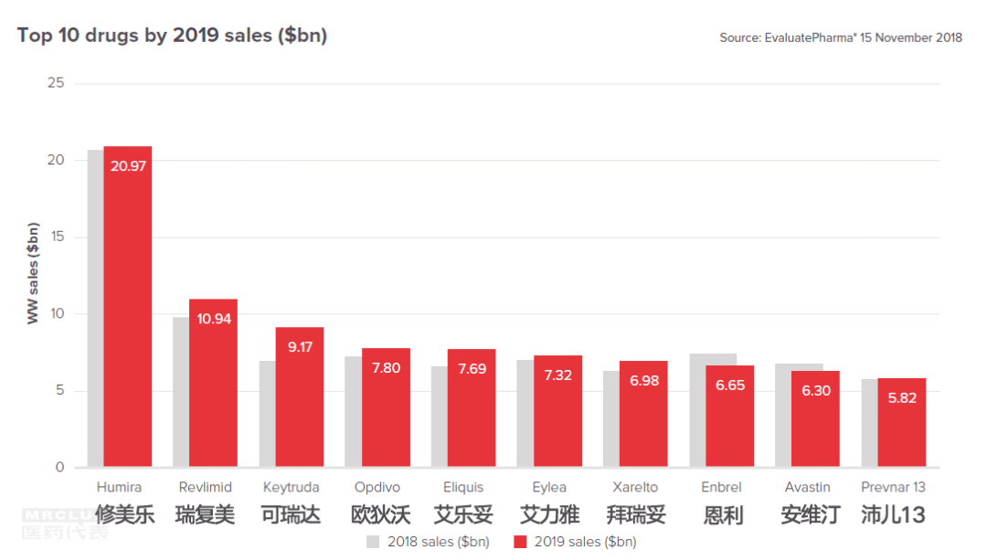 下面是 EP Vantage 這份報告中2019年全球10大最暢銷藥物預(yù)測,有沒有你負責的藥品呢?