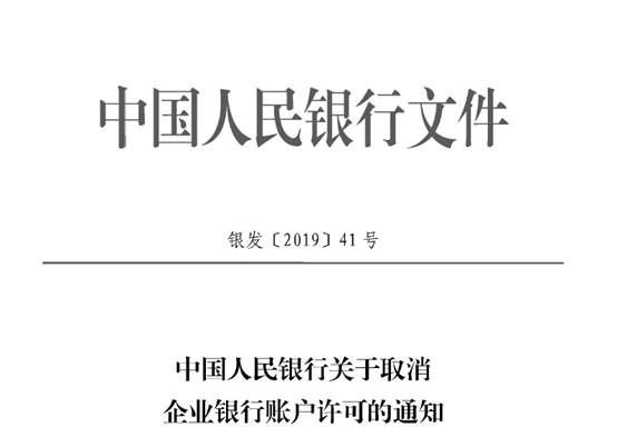 1. 從2019年2月25日起,開始取消企業(yè)銀行賬戶許可證,2019年底前實現(xiàn)全國完全取消。企業(yè)在銀行開立基本賬戶、臨時賬號,由核準(zhǔn)制改為備案制。