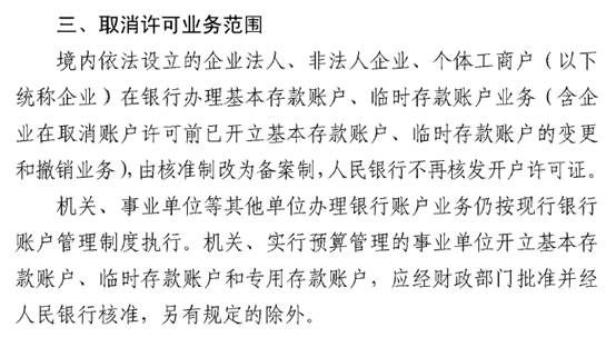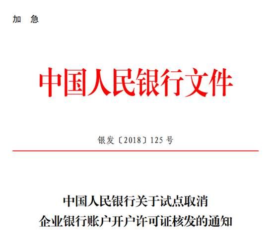 2月12日中國人民銀行正式發(fā)布《關(guān)于取消企業(yè)銀行賬戶許可的通知》的文件,規(guī)定了取消企業(yè)銀行賬戶許可,并將加強企業(yè)賬號和資金管理!
