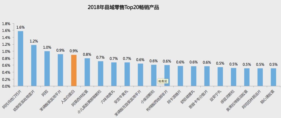 再來看看TOP20暢銷產(chǎn)品,以慢病用藥居多。例如阿托伐他汀鈣片、硫酸氫氯吡格雷片、苯磺酸氨氯地平片等,都是市場需求非常大的慢病用藥。值得一提的是,2018年人血白蛋白由于渠道的轉(zhuǎn)移,成為縣域藥品渠道的新興產(chǎn)品。
