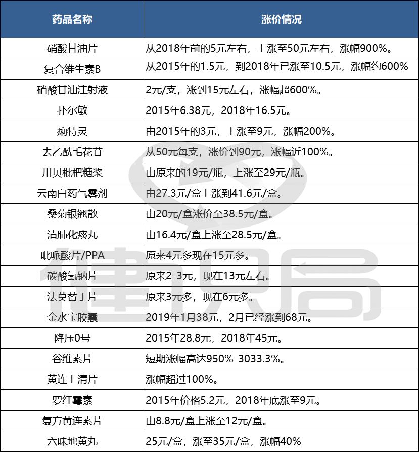 據(jù)統(tǒng)計(jì),感冒常用藥撲爾敏100片裝,從2015年至2018年底,價(jià)格上漲了158%;急救藥硝酸甘油片,漲幅達(dá)到900%,還出現(xiàn)了斷貨情況;部分藥品,如:谷維素片,短期內(nèi)價(jià)格上漲幅度甚至超過(guò)3000%。