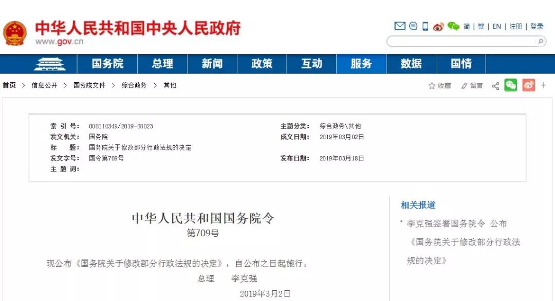 2019年3月18日,國(guó)務(wù)院發(fā)布《關(guān)于修改部分行政法規(guī)的決定》,其中包括《中華人民共和國(guó)藥品管理法實(shí)施條例》、《化妝品衛(wèi)生監(jiān)督條例》、《艾滋病防治條例》等的修訂決定,并自公布之日起施行: