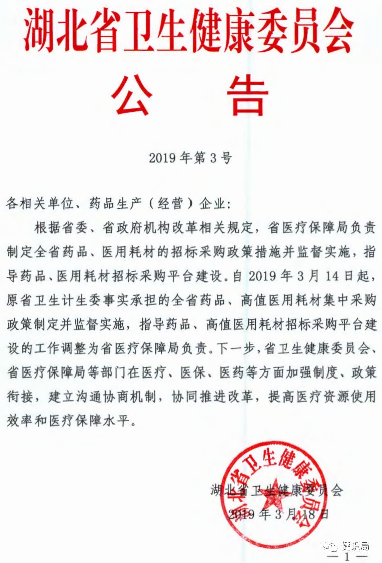 昨天(3月18日)湖北衛(wèi)健委發(fā)布公告稱,自3月14日起,原省衛(wèi)計(jì)委事實(shí)承擔(dān)的全省藥品、高值醫(yī)用耗材集中采購政策制定并監(jiān)督實(shí)施,指導(dǎo)藥品、高值醫(yī)用耗材招標(biāo)采購平臺(tái)建設(shè)的工作調(diào)整為省醫(yī)療保障局負(fù)責(zé)。