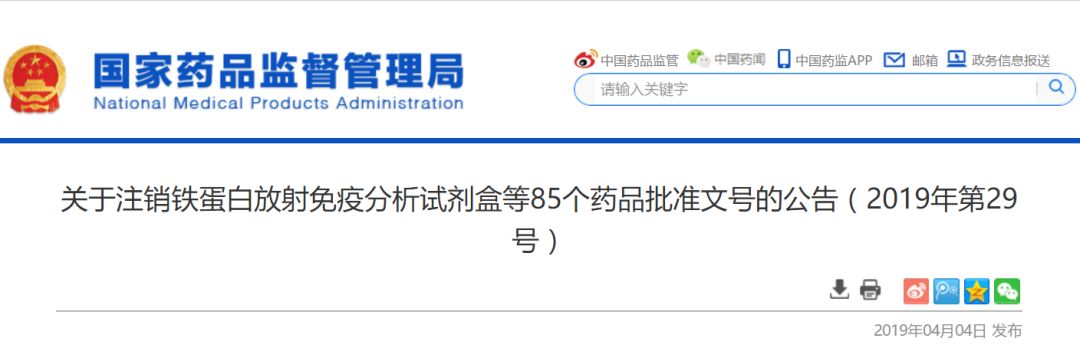 昨日(4月4日),國家藥監(jiān)局官網(wǎng)發(fā)布《關(guān)于注銷鐵蛋白放射免疫分析試劑盒等85個藥品批準(zhǔn)文號的公告》(以下簡稱《公告》)。