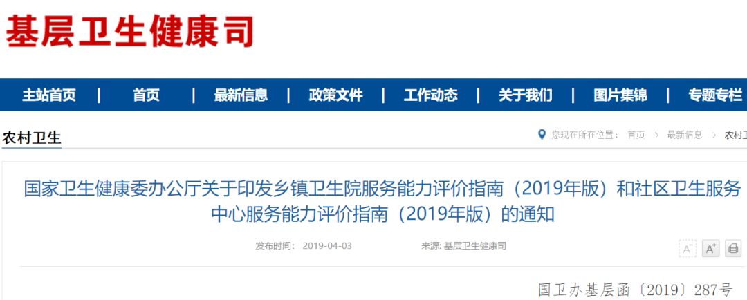 昨天(4月3日),國(guó)家衛(wèi)健委官網(wǎng)發(fā)布《國(guó)家衛(wèi)生健康委辦公廳關(guān)于印發(fā)鄉(xiāng)鎮(zhèn)衛(wèi)生院服務(wù)能力評(píng)價(jià)指南(2019年版)和社區(qū)衛(wèi)生服務(wù)中心服務(wù)能力評(píng)價(jià)指南(2019年版)的通知》明確,從功能任務(wù)和資源配置、基本醫(yī)療和公共衛(wèi)生服務(wù)、業(yè)務(wù)管理和綜合管理等方面,細(xì)化說(shuō)明可操作性標(biāo)準(zhǔn),推動(dòng)基層醫(yī)療衛(wèi)生機(jī)構(gòu)對(duì)照整改和提升。