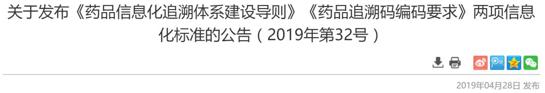 4月28日,國家藥監(jiān)局發(fā)布公告公布了《藥品信息化追溯體系建設導則》和《藥品追溯碼編碼要求》兩項信息化標準,明確了藥品信息化追溯體系的建設、參與方構(gòu)成及基本要求,藥品追溯碼的基本要求等具體規(guī)范和標準,并要求自發(fā)布之日起實施。
