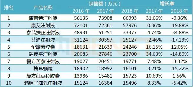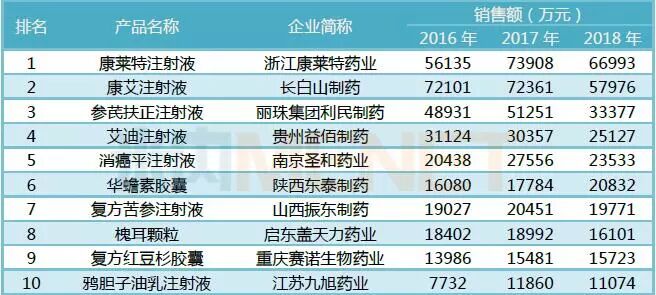 2018年重點(diǎn)城市公立醫(yī)院抗腫瘤中成藥產(chǎn)品TOP10銷售額合計(jì)30億元,占重點(diǎn)城市公立醫(yī)院抗腫瘤中成藥銷售額比例超過55%;除了華蟾素膠囊、槐耳顆粒和復(fù)方紅豆杉膠囊外,7個(gè)均是注射劑產(chǎn)品。