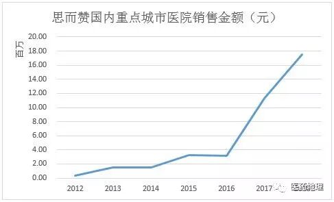 中國醫(yī)藥工業(yè)信息中心藥物綜合數(shù)據(jù)庫PDB顯示,2017年開始,思而贊在國內(nèi)重點(diǎn)城市醫(yī)院的銷售金額出現(xiàn)爆發(fā)式增長。
