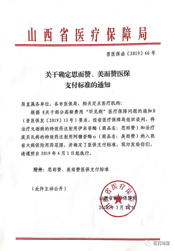 4月2日,山西省藥械集中競價(jià)采購網(wǎng)發(fā)布《關(guān)于確定思而贊、美而贊醫(yī)保支付標(biāo)準(zhǔn)的通知》,指出根據(jù)《關(guān)于部分高額費(fèi)用“罕見病”醫(yī)療保障問題的通知》(晉醫(yī)保發(fā)[2019]13號)要求,經(jīng)醫(yī)療保障局組織談判,將治療戈謝病的特效藥注射用伊米苷酶(商品名:思而贊)和治療龐貝氏病的特效藥注射用阿糖苷酶α(商品名:美爾贊)納入大病保險(xiǎn)用藥范圍,并確定了醫(yī)保支付標(biāo)準(zhǔn)。其中,思而贊(400單位/瓶)的醫(yī)保支付標(biāo)準(zhǔn)為20700元/瓶,美爾贊(50mg/支)為5306.3元/支。