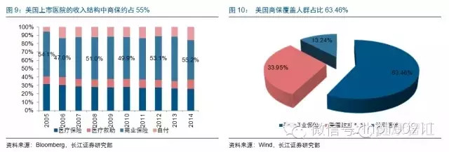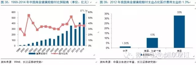 在我國的醫(yī)療保險支付格局中,商業(yè)保險公司賠付僅占約1.4%,我們參考美國醫(yī)療保障覆蓋人群中,商業(yè)健康險覆蓋了約63.46%人群、占比醫(yī)療費用支出約35%,美國上市醫(yī)院來自商業(yè)保險的收入約55.2%??梢灶A(yù)見,我國商業(yè)健康險亟待發(fā)力,面臨十倍以上的成長空間。
