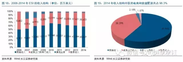 從收入結(jié)構(gòu)來看,ESI的主要營業(yè)收入來源于藥品供應(yīng)層面的兩大主要細(xì)分鏈條,即網(wǎng)絡(luò)藥房零售(Retail phamacy network)和藥品的家庭配送(Home delivery pharmacy)。2014年報數(shù)據(jù)顯示,醫(yī)藥電商收入占比高達(dá)58%,藥品的家庭配送服務(wù)收入占比約為38%,合計超過96%,并且該比例呈現(xiàn)上升趨勢。