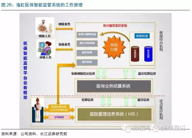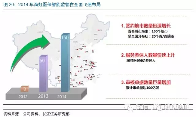 “湛江模式”在醫(yī)保基金管理模式的突破,是海虹大健康生態(tài)圈進(jìn)程中的重要里程碑,其內(nèi)涵包括:1、智能審核控費和支付評審,湛江社?;饘⒁院:绲脑露葘徍私Y(jié)算數(shù)據(jù)為參考指標(biāo),進(jìn)行費用的核定和撥付,并與醫(yī)院進(jìn)行核查、分析、評審;2、醫(yī)保大數(shù)據(jù)分析,提供基金科學(xué)管理的決策支持;3、建立醫(yī)保支付價格庫和評價體系,基于1999年開始在藥品、耗材招標(biāo)采購價格知識庫的積累,建立藥企、醫(yī)院、醫(yī)保之間的定價機(jī)制和醫(yī)療服務(wù)質(zhì)量的評價體系;4、藥品器械集中采購(GPO),掌握了代表醫(yī)保向上游藥企議價的權(quán)利,極大利好公司醫(yī)藥電商業(yè)務(wù)的開展;5、建立個人健康檔案,參保人可實現(xiàn)基于移動APP進(jìn)行歷史健康數(shù)據(jù)的查詢,并為其提供綜合性醫(yī)療健康落地服務(wù)等。