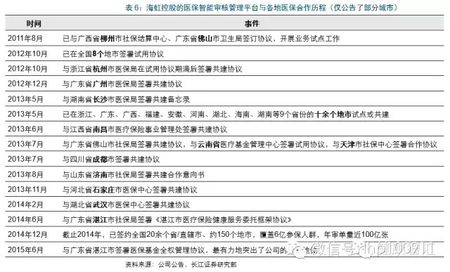 PBM系統(tǒng)的控費審核僅僅是海虹控股的叩金石,由控費向掌握數(shù)據(jù)資源、醫(yī)療落地服務(wù)資源,進(jìn)而向綜合醫(yī)療服務(wù)延伸才是其核心宗旨。2015年6月11日,海虹控股公告與湛江簽署《湛江市基本醫(yī)療保險支付審核服務(wù)委托協(xié)議》,全權(quán)委托海虹作為專業(yè)服務(wù)機(jī)構(gòu)進(jìn)行湛江市醫(yī)?;饘徍?、支付、評價以及參保人服務(wù)等,標(biāo)志著海虹PBM業(yè)務(wù)從“控費”升級為“醫(yī)?;鹑珯?quán)管理”,是屬國內(nèi)首創(chuàng),體現(xiàn)出公司強(qiáng)大的頂層資源整合能力,有望在其他核心合作城市大范圍異地復(fù)制,具有劃時代意義!